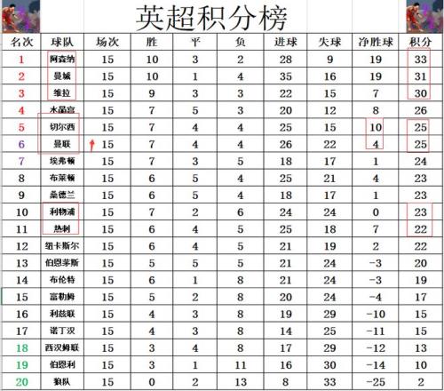 積分榜方面,本輪比賽全部結束,阿森納的領先優(yōu)勢被曼城縮小到只差2分,維拉差阿森納3分排在第3。曼聯今天客場大勝狼隊及時止住頹勢,超過利物浦2分,追上切爾西,凈勝球劣勢排在切爾西之后升至第6。主場慘敗的狼隊依然是本賽季唯一沒有贏球的球隊,15輪只拿到2分的他們幾乎是預定了一個降級名額。